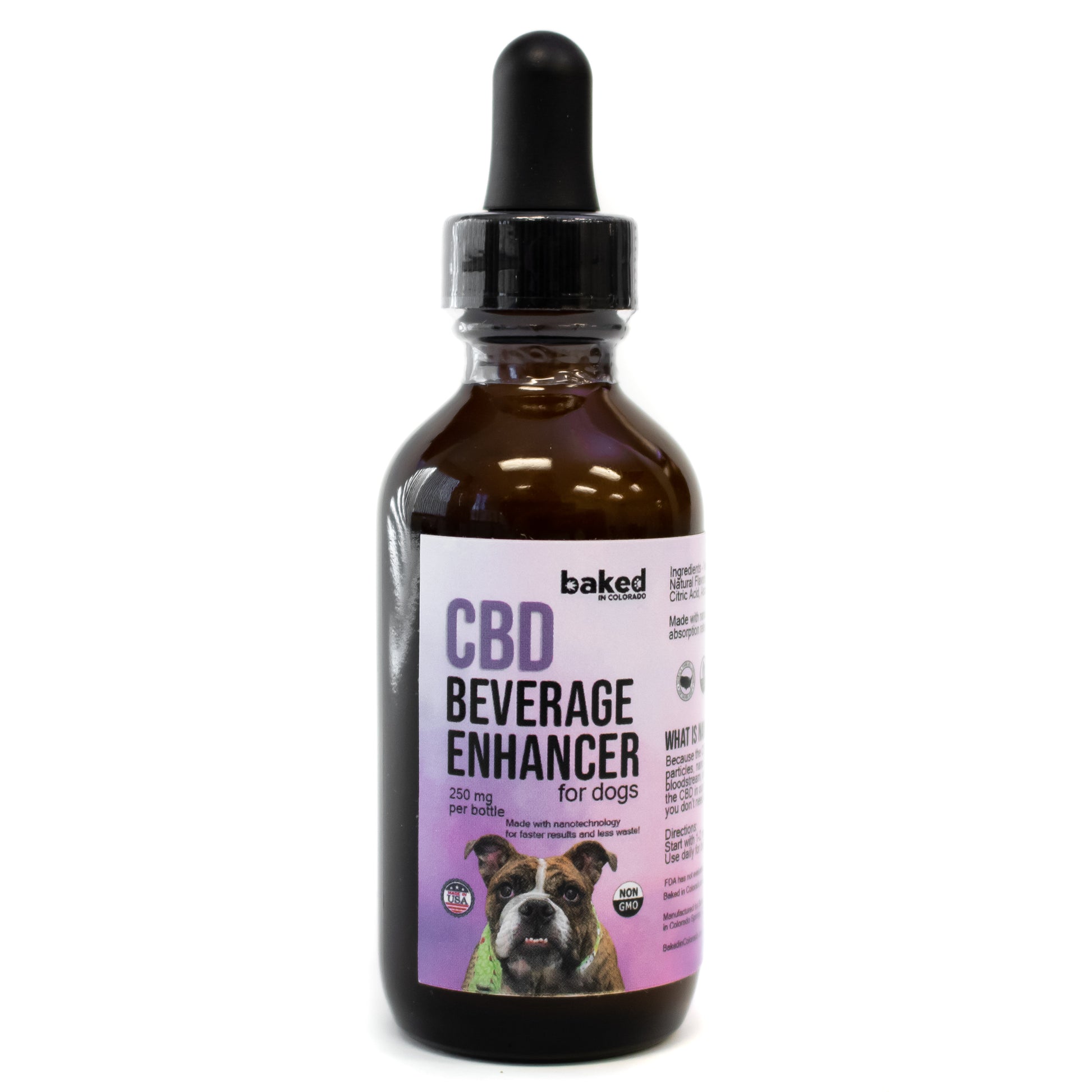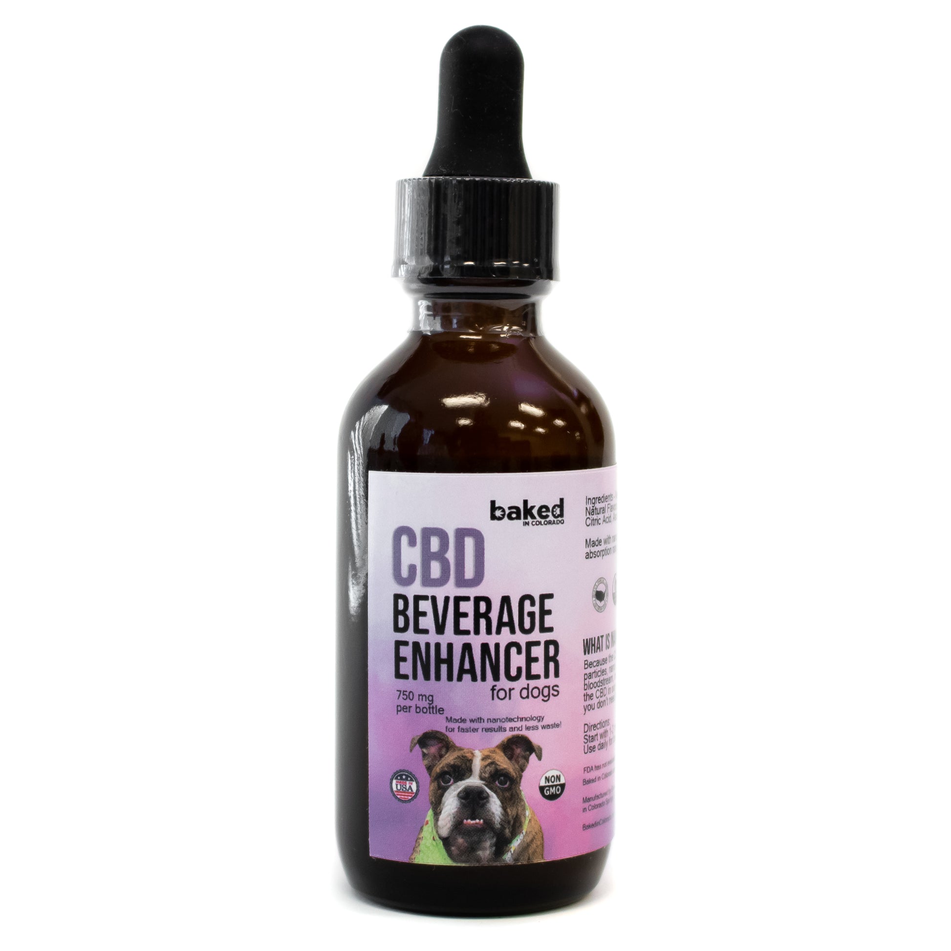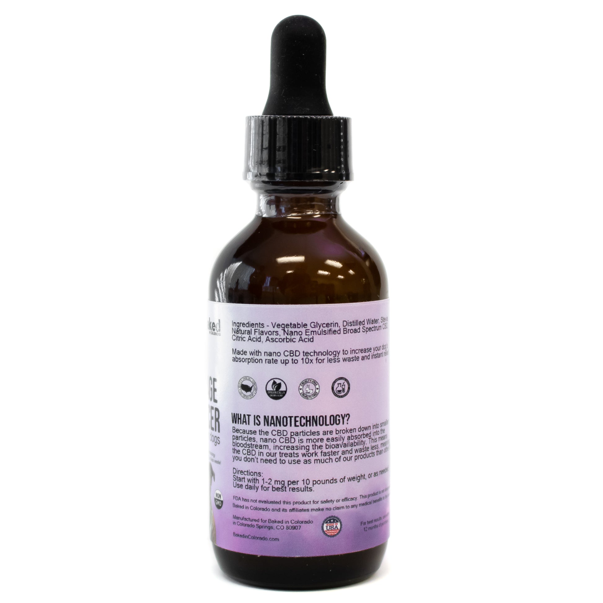 Baked in Colorado CBD beverage enhancers for dogs and CBD dog treats are non GMO, contain zero THC, and are made with organically grown hemp. All of our pet CBD products are made with NANO CBD, which makes the CBD more easily absorbed by your pup, and will work faster than the leading brand. All Baked in Colorado products have been third party lab tested for quality and potency.